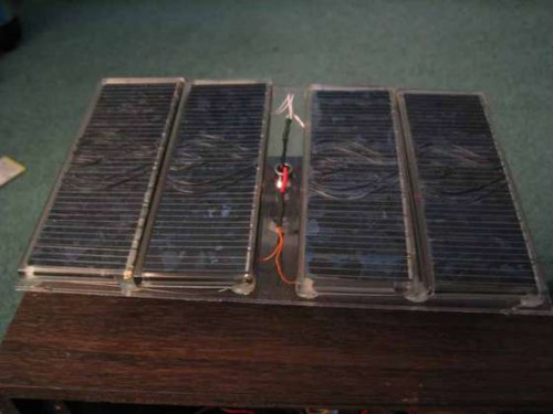 Ku 4.5VDC 50mA panelom som ešte pararelne napojil ešte jeden 9VDC 50mA panel aby som dostal 9VDC napätie 100mA prúd.A celé som to pripevnil na stojan.